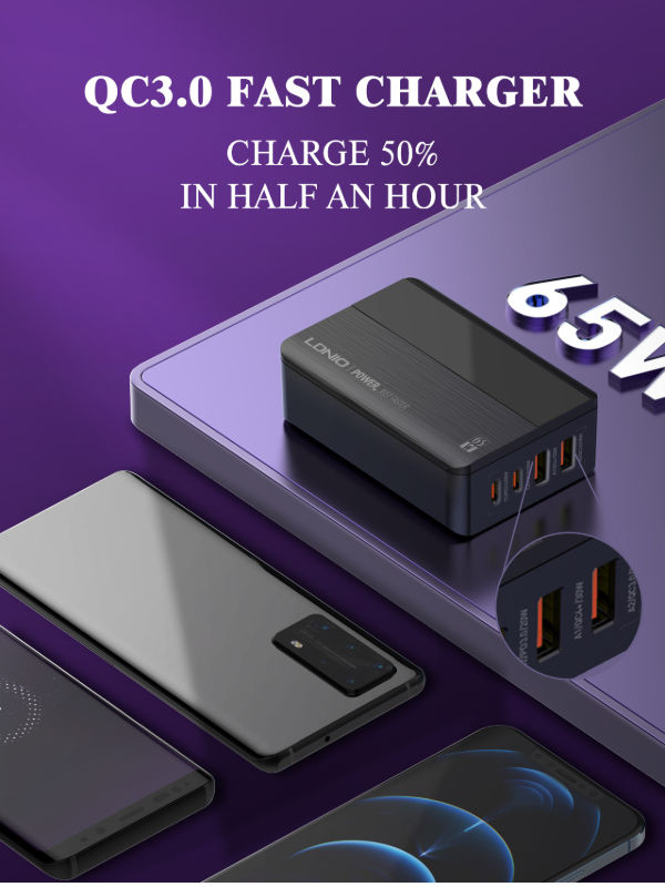 شارژ سریع و همزمان 4 عدد دستگاه، دارای دو عدد پورت خروجی USB و دو عدد پورت خروجی Type-C، مجموع حداکثر توان خروجی کل 65 وات